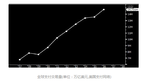 在移动端消费时,人们似乎越来越多地选择数字钱包进行支付,当然,也有很多人喜欢在实体店内刷卡。移动网页和 App 支付交易数量正在激增,其中 PayPal 公司依然处于领导地位,但也出现了不少竞争对手,比如 传统支付巨头 Visa 也开始争夺市场份额。对于近场支付,比如通过智能手机或可穿戴设备上的 Apple Pay、Android Pay、以及 Samsung Pay 等支付渠道所做的支付交易增长服务则出现了放缓趋势。2016 年,PayPal 公司处理的支付交易总金额达到 1020 亿美元,增长幅度达到了 55%;而 Visa 公司在 2016 财年中处理的支付交易总金额为 8 万亿美元。