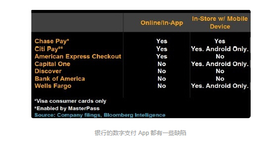 受到影响的企业:美国大通银行在 2016 年 11 月推出了 Chase Pay,在银行移动支付 App 领域里脱颖而出。Chase Pay 最初只是与星巴克和 Best Buy 建立了合作关系,但是之后 Chase Pay 开始支持线上支付、App 应用内置支付、实体店内支付,而且支持苹果和 Android 移动设备。美国银行和发现卡都还没有推出自己的专属移动支付 App。