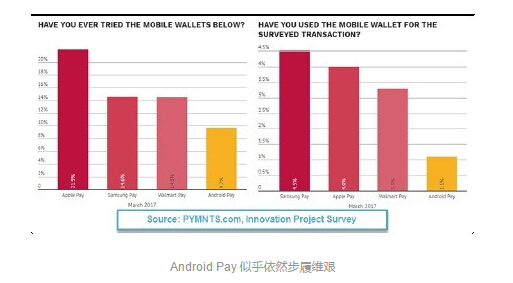 Android Pay 是 Google 公司推出的移动手机支付应用,但是在经过多年投资、产品重新发布、品牌重塑之后,用户使用率和普及率依然表现不是很好。同样是来自金融科技网站 PYMNYS.com 和知名市场调研公司 InfoScout 在今年三月份所做的一份调研显示,只有不到 10% 的受访者表示使用过这款应用,还不到 Apple Pay 用户普及率的一半。当然,这和消费者缺乏产品意识有关,那些用户不愿意使用 Apple Pay 的理由,也同样出现在了 Android Pay 身上,包括不少消费者表示自己依然还是习惯于刷卡消费。