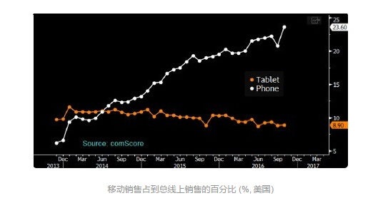 全球性互联网信息服务提供商 ComScore 发布的最新数据显示,2013 年 12 月,美国通过移动设备完成的线上购物额占到全部线上销售金额的 16%,而到了 2016 年 10 月,这一数字达到了 33.3%。在美国,实体店内所产生的零售销售额几乎占到全部零售销售额的 90%,但是这一占比数字却在稳步下降。。2016 年,PayPal 公司的移动支付交易量上涨了 55%。如今,在美国和欧洲最大的线上商户和零售商中,四分之三都能接受 PayPal 支付。2014 年,PayPal 公司以 8 亿美元的价格收购了移动支付公司 Braintree,现在,他们可以为所有线上和移动商户提供支付服务,包括 Uber 和 Airbnb。