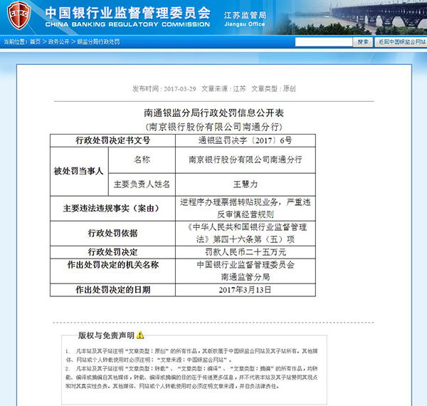 民生银行南通分行因“办理无真实贸易背景的银行承兑汇票贴现”被罚款30万元,做出处罚决定的日期为3月7日;南京银行南通分行则因“逆程序办理票据转贴现业务,严重违反审慎经营规则”而被罚款25万元,做出处罚决定的日期为3月13日。