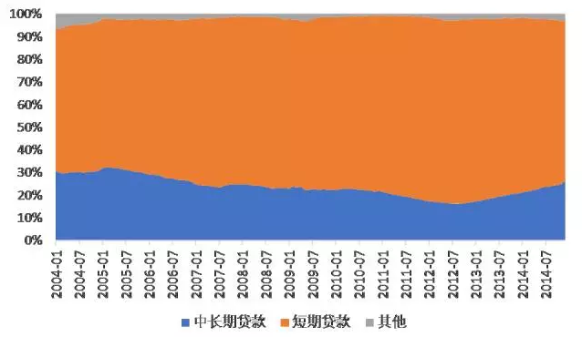 这是温州地区(典型的高利贷的重灾区,国内其他高利贷盛行地区情况都类似)的银行贷款的期限结构。期限一年期以内的贷款为短期贷款,以上的为中长期贷款。温州这个地方,短期贷款占比,从2004年的63%,一路飞升,2011年到达了历史峰值81%!