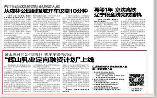为了销售辉山乳业上述融资产品,相关各方在媒体投放广告推广。《辽沈晚报》2016年10月10日刊登的一则广告称,是年“十一”黄金周期间,大连金交所上线新产品辉山乳业定向融资计划,该产品“自上线以来就受到辽沈地区投资者青睐”,并对发行方、担保方的情况进行了介绍。此后,类似广告多次刊发。