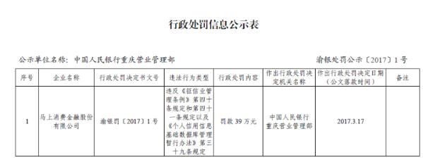 网络整理 2021-03-22 22:09网贷之家综合 据媒体3月27日消息,近日,中国人民银行重庆营业管理部发布渝银罚〔2017〕1号行政处罚决定书显示,马上消费金融股份有限公司被罚款39万元,因其违反规定《征信业管理条例》第四十条规定和第四十一条规定以及《个人信用信息基础数据库管理暂行办法》第三十九条规定。
