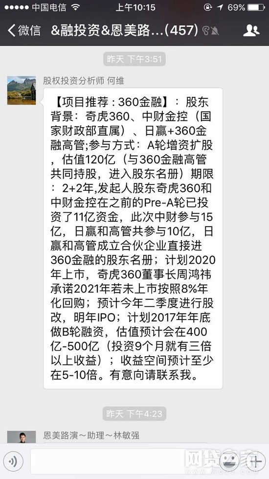 从截图可见,在这个名为“&融投资&恩美路……”的微信群内,“股权投资分析师 何维”发布了一份“项目推荐:360金融”,该项目据称“股东背景”包括奇虎360、日赢+360金融高管,“收益空间预计至少在5-10倍”。