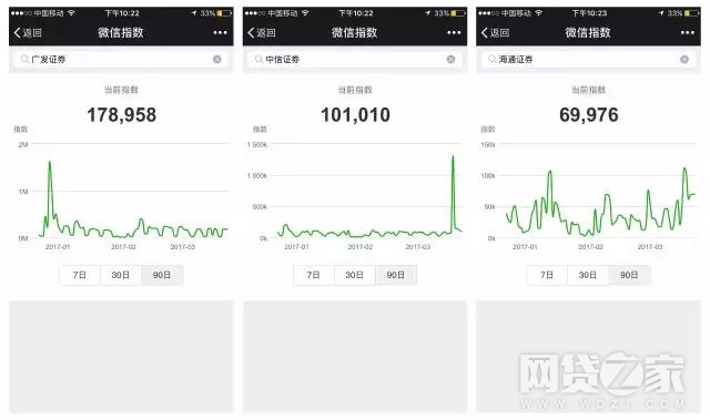 看得出来,不同性质的机构,其微信指数差异性较大。一般来说,银行的指数最高,指数以百万计。而保险和券商其次,基金和P2P最弱,指数低至几千也有可能。