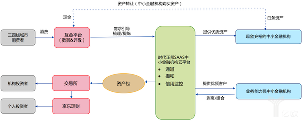 此外,针对该领域的SaaS服务机构也随之兴起,为其提供技术支持。近日,新三板挂牌IT服务商“时代正邦”董事长姜伟斌向亿欧表示,其基于消费信贷的ABS服务体系已经成型(见文末图)。
