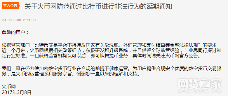 网络整理 2021-03-22 22:25网贷之家综合 3月8日,火币网、比特币中国、OKCoin等多家比特币交易平台发布防范通过比特币进行非法行为的延期通知。通知称,根据相关政策细节,正在与业界同行探讨制定行业标准,一旦获得监管机构认可以后,即可恢复提币业务。