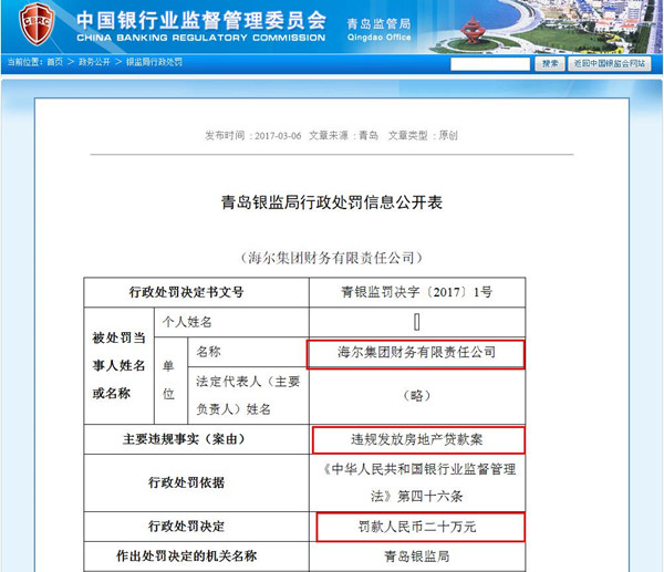 网络整理 2021-03-22 22:263月6日,中国银行业监督管理委员会青岛监管局(青岛银监局)官网挂出青岛银监局行政处罚信息公开表,海尔集团财务有限责任公司因“违规发放房地产贷款”,被罚款20万元。