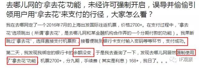 事实上,早在2016年8月“拿去花”就曾出现过类似事件。有网友爆料称,使用去哪儿网支付时点击跳过“拿去花”页面,选择直接付款,并使用银行卡支付,输入密码后显示支付成功,结果第二天发现银行卡没被扣款,经查询是去哪儿网强制使用了“拿去花”功能。