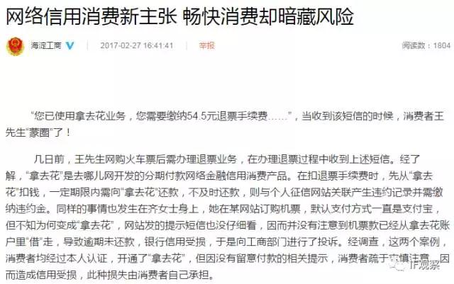 网络整理 2021-03-22 22:28近日,海淀工商局微博点名去哪儿网开发的分期付款网络信用消费产品“拿去花”暗藏风险。微博显示,有消费者在“不知情”的情况下使用“拿去花”,长时间未还款,导致借款逾期,产生违约金。
