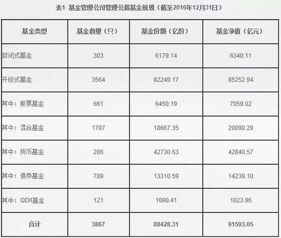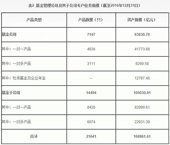 可比口径和数据显示,截至2016年12月31日,基金管理公司管理公募基金规模9.16万亿元,基金管理公司及其子公司专户业务规模16.89万亿元,分别较2015年底增长9.4%和34.05%。公募基金与专户总规模为26.05万亿元。