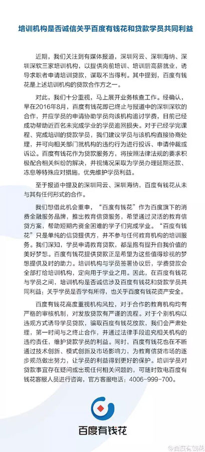 对于此次事件,百度金融官方回应称,上述三家教育机构中,与深圳深软的合作已经在去年终止,而与另外两家从未有过合作关系。与此同时,百度金融强调,他们对于合作机构有完整的审核机制,并严格把控贷款流程。