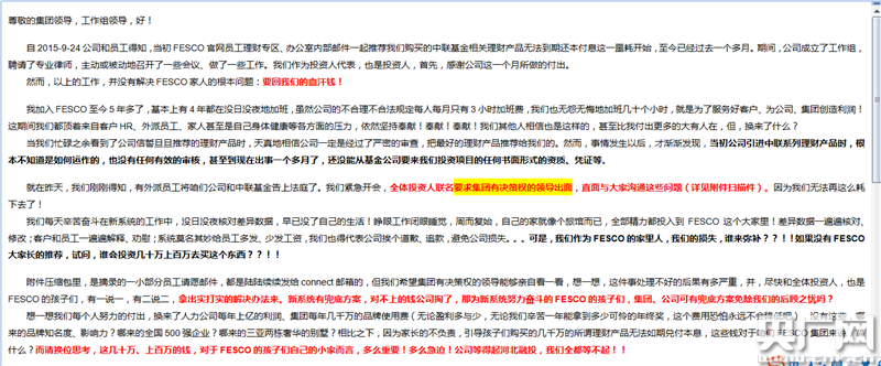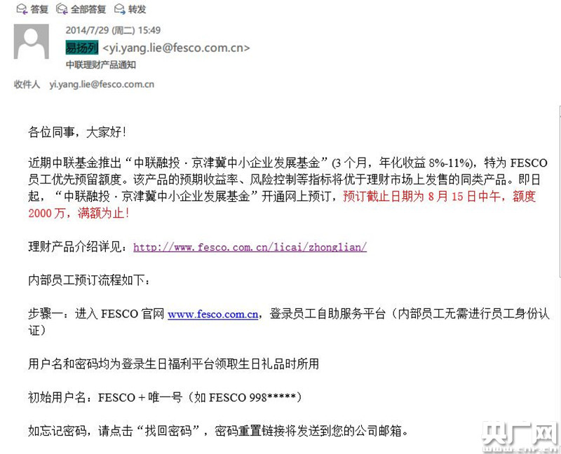 FESCO向员工发邮件推荐理财产品
