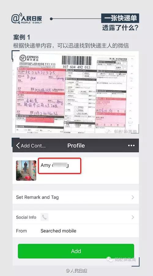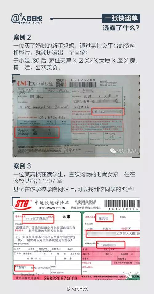 一张快递单包含了哪些敏感信息?比如:买了奶粉的新手妈妈,通过某社交平台的资料和照片能拼凑出一个画像:于小姐,80后,家住天津X区xxx大厦X座X房,有一娃,喜欢美食。再看:在读的某高校学生,喜欢购物的时尚妹子,住在该校某宿舍1207室,蚁侠君甚至在该学校学院网站上找到该同学照片。