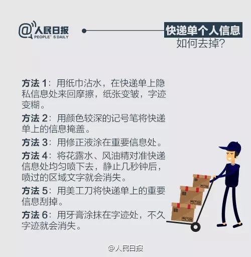 6、丢弃快递单前,用油性笔、纸巾沾水、修正液、花露水、风油精、美工刀、牙膏等将收件人、发件人、快递单号都涂抹掉,包括自己的签字都必须涂抹干净。