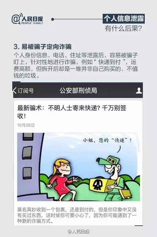 易被骗子盯上定向诈骗个人身份信息、电话、住址等隐私信息泄漏容易被骗子盯上,针对性“量身定做”,比如:快递到付,拆开后发现是一堆并非自己购买、不值钱的垃圾。