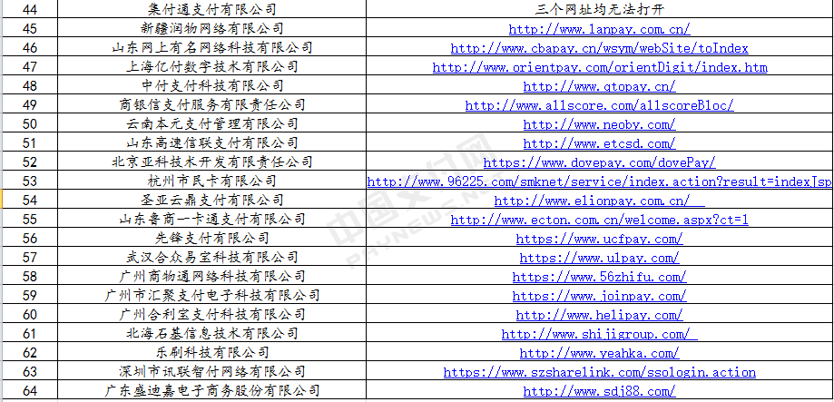 在中国支付网整理的64家未公示的支付机构中,除了支付宝、财付通、拉卡拉外,还有去年被美团收购的钱袋宝、被小米收购的捷付睿通、被恒大收购的集付通等公司。