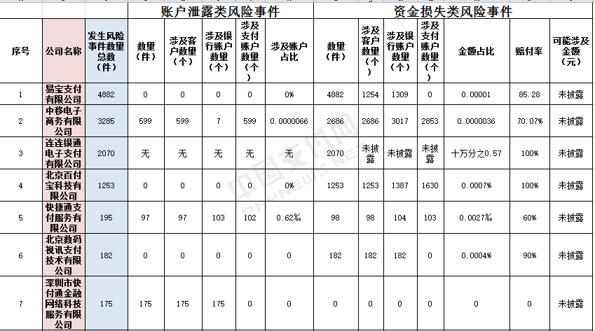 在公开披露的风险事件中,只有3家支付机构公布了风险损失事件可能涉及的金额,其中通联支付风险损失可能涉及的金额为447248元、银联商务风险损失可能涉及的金额为120000元、天下支付风险损失可能涉及的金额为142290.3元。