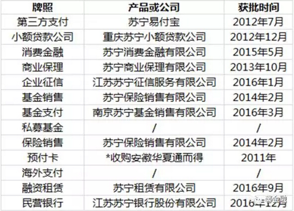 其中,牌照布局时间短但是最为齐全的,可能要数苏宁集团。从2012年到2016年底,苏宁一共获得了13块金融牌照,从第一块第三方支付牌照,到最后也是最重要的一块民营银行牌照,苏宁只用了不到五年时间,足见其出手的“稳准狠”。