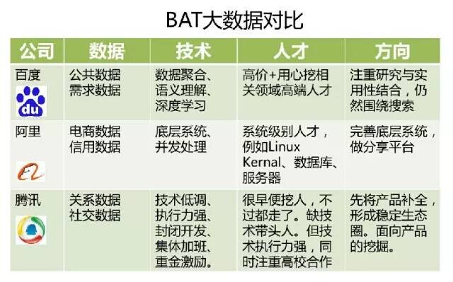 BAT三家公司,数据体积相差不会太多, 三家几乎都有LBS、交易、社交等一系列不同维度数据,只是能力有所区别。