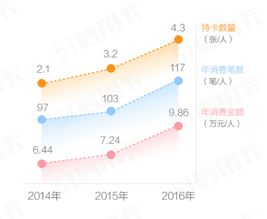 “51信用卡管家”APP发布的《2016信用卡活跃用户消费报告》指出,截至2016年底,活跃信用卡用户的人均持卡量已增至4.3张,较2015年增长34.38%。与此同时,活跃信用卡用户的人均年消费金额也从2015年的7.24万元增加至9.86万元。