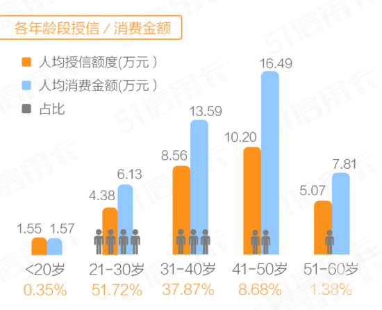 其中,21-30岁之间的用户群是信用卡主要发卡对象,人均授信额度和人均消费额最高的年龄段均分布在41-50岁之间。