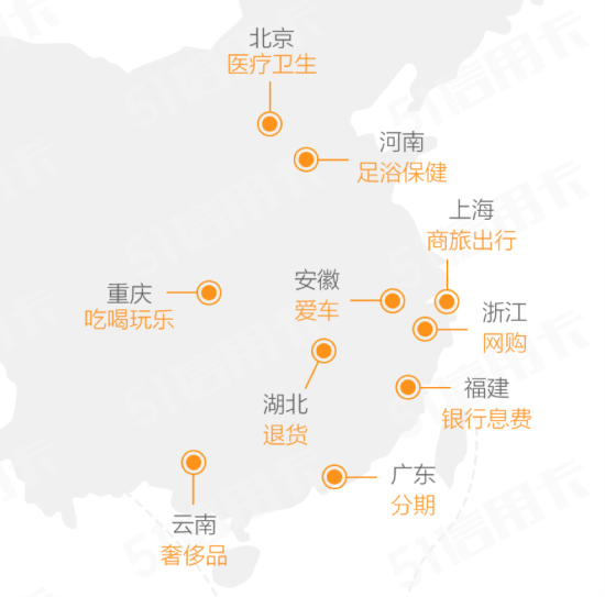 此外,不同地区的信用卡消费习惯也不尽相同。其中,浙江作为电子商务大省以网购消费居多,上海作为金融中心以商旅出行消费为主,人口大省河南则更偏好刷卡进行养生保健,云南地区竟以奢侈品消费独树一帜。