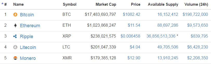 世界前五大数字货币:比特币、以太币、瑞波币、莱特币、门罗币。数据来源:coinmarketcap.com