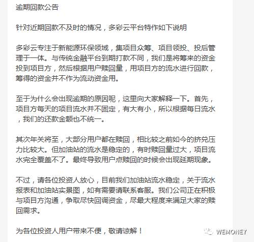 对此,凤凰WEMONEY向多彩云众筹工作人员了解到,出现逾期的众筹项目为某加油站项目,由于项目方资金运转出现了一些问题,导致用户赎回的时候出现逾期。但对于具体项目名称、逾期金额等,该人员没有给出具体回复。