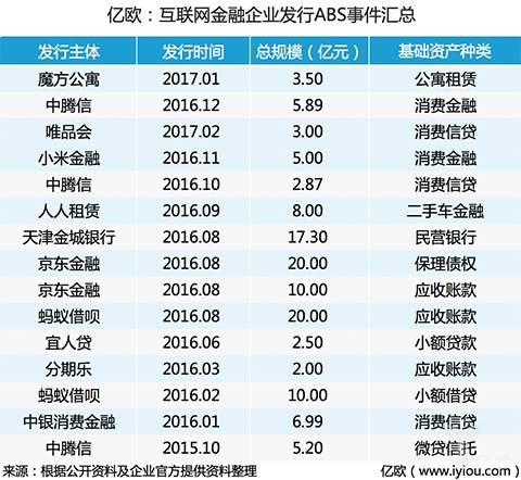 值得注意的是,近期消费金融ABS形成一股热潮,2016年11月,小米金融挂牌5亿元消费金融ABS产品。据亿欧不完全统计,近两年,互联网金融平台发行ABS数量及募资金额持续增加,涉足ABS的互联金融企业包括:阿里、京东金融、小米金融、宜人贷、魔方公寓、分期乐、中腾信、人人租赁、中银消费等,已发行的ABS资金规模合计已逾200亿元,整体互联网消费金融ABS市场呈现普及化、常态化。