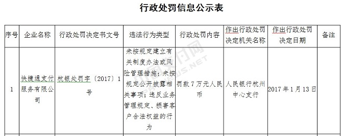 网络整理 2021-03-22 22:52杭州人行1月23日公示一批处罚文件,其中快捷通支付服务有限公司因“未按规定建立有关制度办法或风险管理措施;未按规定公开披露相关事项;违反业务管理规定、损害客户合法权益的行为”,被罚款7万元人民币。