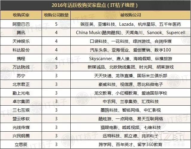 2016年最活跃的买家当属阿里巴巴,披露了5起并购事件,涉及行业比较多元化,也彰显了阿里巴巴的生态圈足够大。豌豆荚是移动互联网时代的应用商店与app分发入口,近几年来业绩下滑,最后2亿美元卖给了阿里巴巴,弥补阿里的移动渠道;亚博科技是一家在香港上市的彩票公司,阿里巴巴斥资23.88亿港元收购了59.45%的股份,亚博科技将成为阿里巴巴及蚂蚁金服独家彩票业务平台;杭州星际主要从事杭州星际影城经营与管理、电影放映及其他相关业务,旗下拥有11个影厅,由阿里影业1亿元收购80%股份;五千年药业则是一家医药零售连锁店,持有互联网药品交易服务资格证书,被阿里健康1680万元收购;最后一家公司Lazada是东南亚第一电商,是阿里巴巴海外战略的重要组成部分。