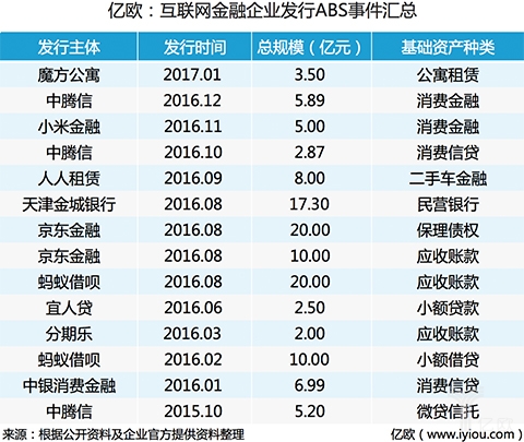据亿欧不完全统计,近两年,国互联网金融平台发行ABS数量及募资金额持续增加,涉足ABS的互联网金融企业包括:阿里、京东金融、宜人贷、魔方公寓、分期乐、中腾信、人人租赁、中银消费等,已发行的ABS资金规模合计已逾200亿元。
