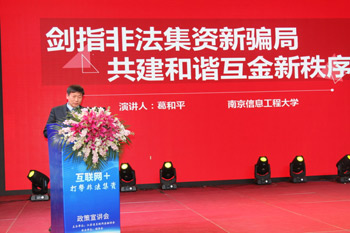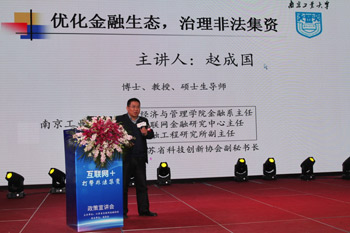南京工业大学经济管理学院金融系主任赵成国教授首先做了主题为“加强政府监管,打击非法集资”的演讲。他主要从国家近年来出台的关于打击非法集资的政策对非法集资的概念界定、相关特点以及危害等内容进行全面的讲解。他表示非法集资犯罪包括擅自发行股票、公司、企业债券罪,非法吸收公众存款罪,非法经营罪,集资诈骗罪等7个罪名,非法集资的隐蔽性强,诱惑性大,熟人参与且积极性高,集资手段网络化等特征。