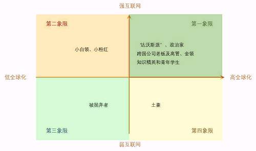 第一象限,高全球化、强互联网。他们是“达沃斯派”、政治家、跨国公司老板及高管、金领们、推动全球化的知识精英和青年学生,他们是全球化的推动者和主力军。