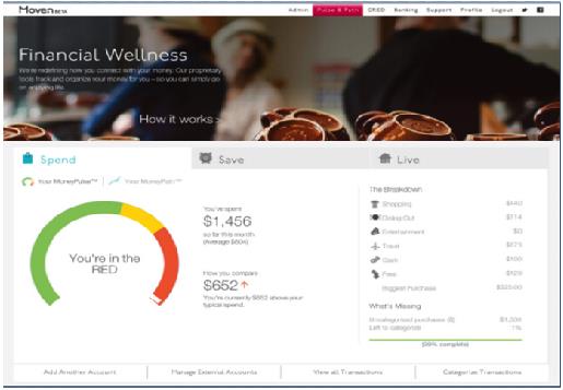 Moven基于手机App面向客户提供的服务主要有:智能财务管理功能MoneyPulse和MoneyPath;测试客户信用分数CREDScore;财务个性测试;非接触式支付;朋友间转账;直接存款功能等等。