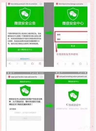 是不是看起来很像微信?别大意,信它你就中招了!这一系列操作后,网页会要求你提供微信账号、微信密码、支付密码、登录验证码。没错,只要你提供这些信息,你的微信就被对方掌握了。绑定的银行卡什么的,也就……呵呵!