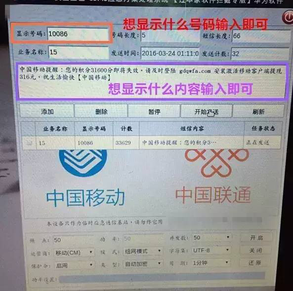 仅仅只有这个软件就可以了吗?当然不行,他还需要一个主机和用于运行这个软件的电脑,俗称“伪基站”。可以放在汽车里,也可以用电动车、摩托车带着,甚至可以背在身上。骗子有了这套“伪基站”,只要四处走动,就可以向周围的人发送这些诈骗短信了。