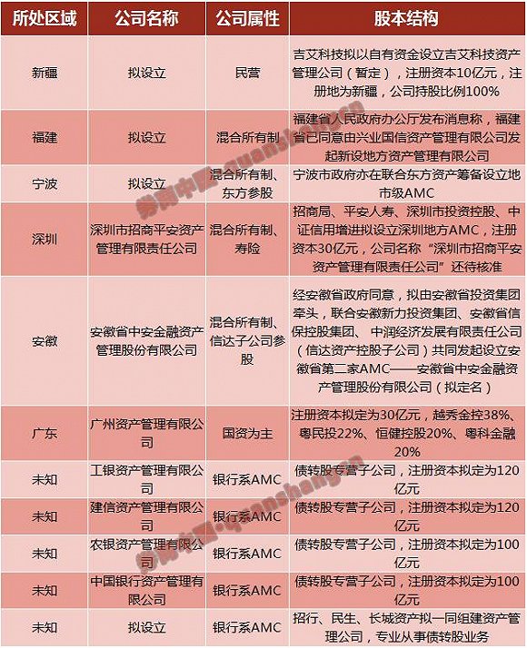 除地方AMC外,正在筹建的还有银行系AMC,即由四家国有大行分别拟设的债转股专营子公司,以及由招行、民生银行联合长城资产组建的专业从事债转股业务的资产管理公司。