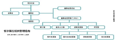 但据恒丰银行人力资源部人士提供的一份恒丰银行组织架构图显示,董事会架构下,除了常规的董事会委员会外,还有“董事会层面部门”,下辖组织人力部、审计部、国内机构发展部等。而在其他银行,很少将“组织人力部”“审计部”等经营管理部门直接下设在董事会。