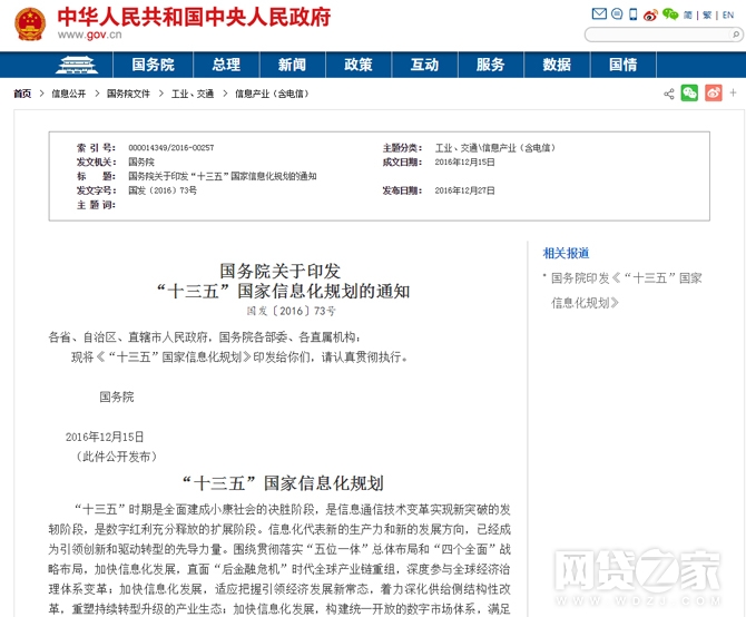 点击链接查看《国务院关于印发“十三五”国家信息化规划的通知》原文:http://www.gov.cn/zhengce/content/2016-12/27/content_5153411.htm