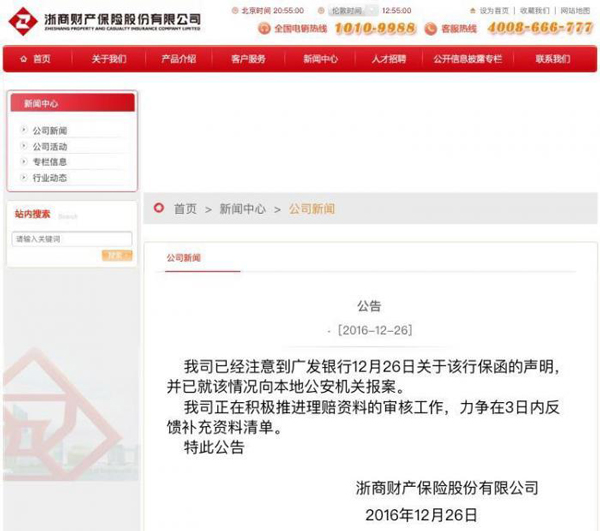 12月26日晚间,浙商财险再度发布公告称,已经注意到广发银行12月26日关于该行保函的声明,并就该情况向本地公安机关报案。