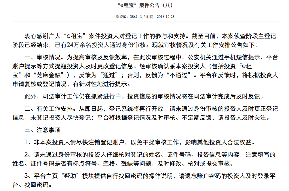 e租宝最新进展:24万余名投资人通过身份审核