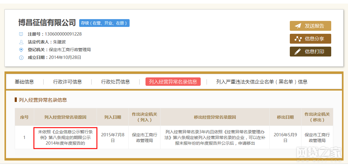 工商信息显示,2015年7月8日,博昌征信有限公司因未依照《企业信息公示暂行条例》第八条规定的期限公示2014年度年度报告被保定市工商行政管理局列入经营异常名录信息。