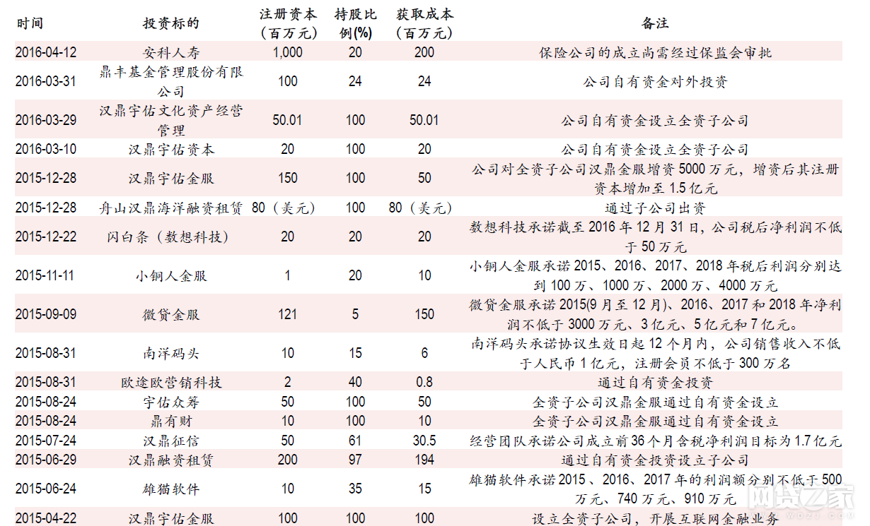 与当时的多伦股份(现匹凸匹)不同,汉鼎宇佑的确是实实在在地向互联网金融转型。其以智能城市为基础转型互联网金融,于去年4月成立全资子公司汉鼎宇佑金服,标志着企业转型进入高速通道。去年6月25日公告拟投资获取熊猫软件35%股权,奠定互联网金融业务的技术基础;6月30日公告出资设立融资租赁公司,开展互联网金融板块P2G业务;7月13日公告拟投资控股湘财资本,补齐资产管理短板;7月27日设立数据征信子公司;8月25日公告投资设立宇佑股权众筹以及P2P平台鼎有财;9月9日公告收购微贷网和长行租赁股权,实现了公司在P2P、融资租赁、汽车金融三大领域的战略布局;11月天使投资小铜人金服……今年4月甚至开始投资保险公司试图获得金融牌照。其布局互联网金融垂直产业链,打造资产端、资金端、外围服务闭环生态圈的野心可见一般。