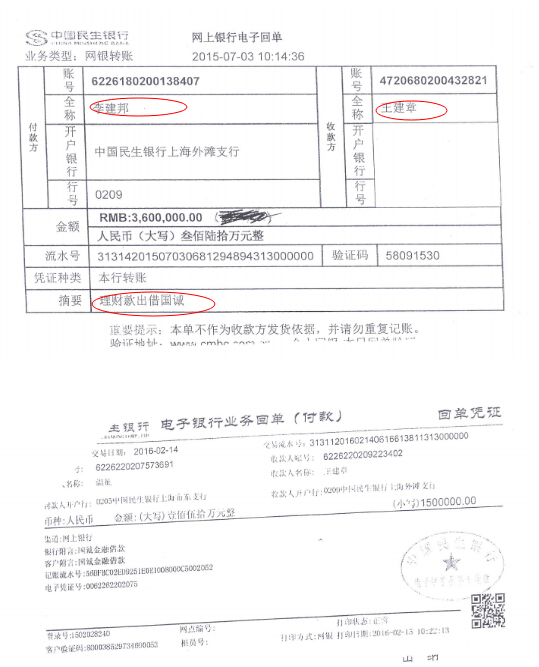 国阳财富借给国诚金融的资金不以公司账户往来,而是以银行的“私人账户”,或经由上海富友第三方支付平台汇出。部分银行电子回单显示,汇款人分别为李建邦(国阳财富股东)、温征,收款人为王建章,摘要为“理财款出借国诚”、“借款”、“国诚金融借款”。
