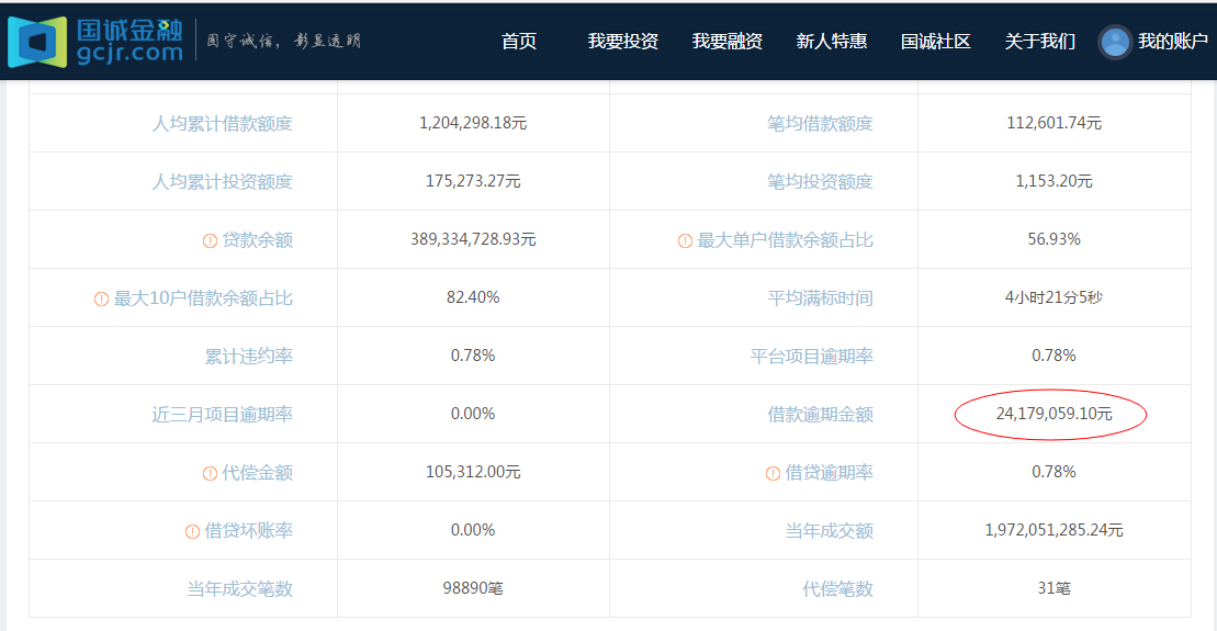 到9月29日,国诚金融官网发出通知,将于10月15日上午召开全体股东会,召集人和主持人为董事长劳婕怡。遗憾的是股东大会最后未如期举行。10月17日,国诚又发公告,是关于提现额度调整方案,提现额度=续投金额*20%,提现额度当天投资满标即可获得,申请的提现按照T+1支付。截止目前,国诚官方网站的多数项目仍在还款当中,逾期金额24,179,059.10元。