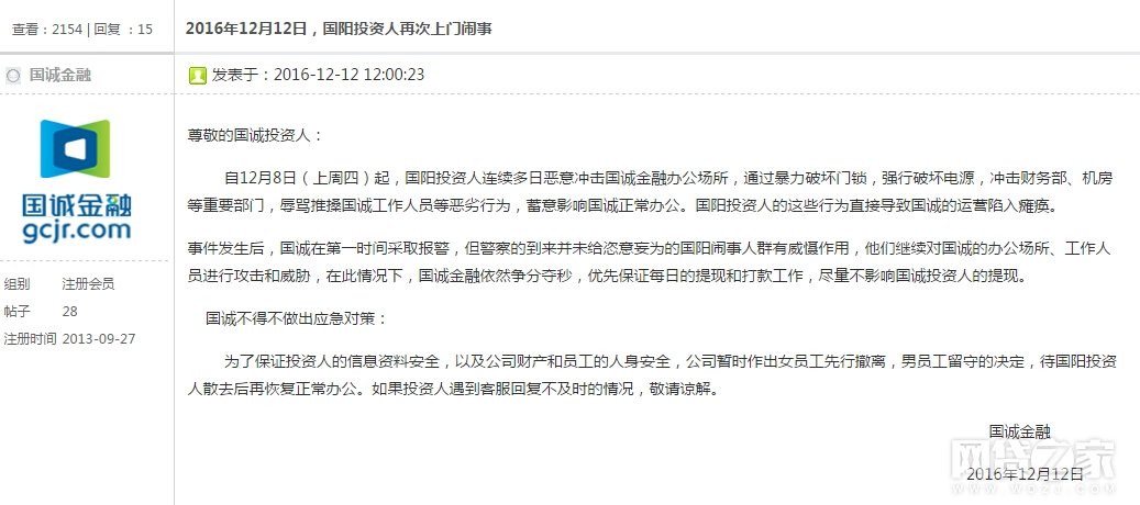 网络整理 2021-03-22 23:23网贷之家综合 12月12日午间,国诚金融在其官网社区发公告称,自12月8日起,国阳投资人一再上门闹事,导致其无法正常办公,并说是为了保证投资人的信息资料安全,以及公司财产和员工的人身安全,公司暂时作出女员工先行撤离,男员工留守的决定,待国阳投资人散去后再恢复正常办公。