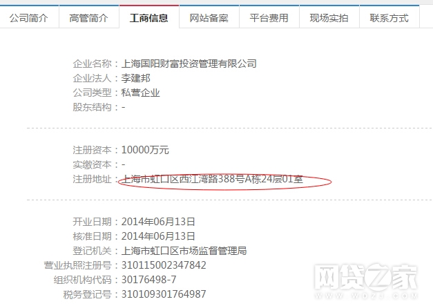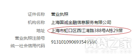 在网贷之家的网贷档案中可看出,国阳财富(全名“上海国阳财富投资管理有限公司”)成立于2014年06月13日,董事长温征,办公地址为上海市虹口区西江湾路388号A栋24层01室。而国诚金融(全名“上海国诚金融信息服务有限公司”),联合创始人、副董事长依然是温征,其办公地址上海市虹口区西江湾路388号凯德龙之梦A栋29层01~04室,“两国”的关系已经非常明确了。